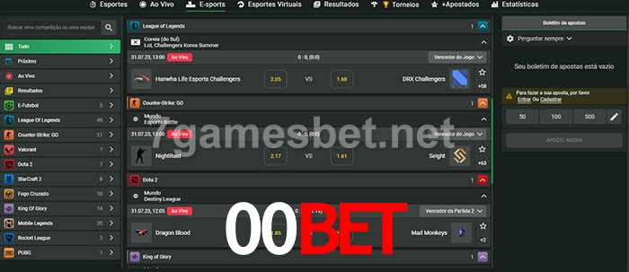 O 00Bet oferece uma grande seleção de opções de apostas em e-sports com probabilidades competitivas